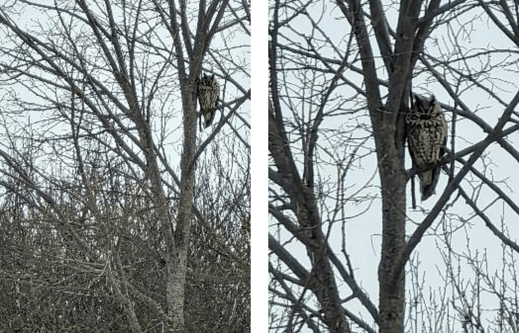 — Наши ребята продолжают внимательно следить за жизнью пернатых обитателей леса. И вот удача! В этот раз им удалось сделать отличные снимки ушастой совы.
