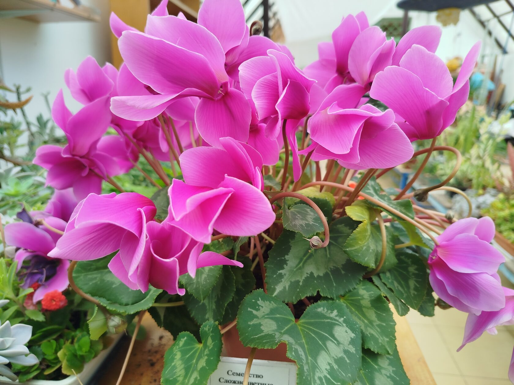 Цикламен (лат. Cyclamen) — многолетнее травянистое растение семейства первоцветных. В природе распространено в бассейне Средиземного моря и странах Западной Азии, несколько видов растут в Крыму и на Кавказе. Обычно начинает цвести в осенний период и продолжает до весны. Имеют характерную форму с изогнутыми лепестками, создавая впечатление «летящих» в воздухе.
