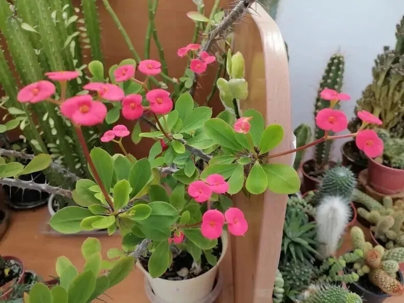 Начнём с Молочая Миля (лат. Euphorbia milii), известного также как «терновый венец». Этот суккулент семейства Молочайные назван в честь барона Пьера Бернара Милиуса, который завёз растение во Францию. Его колючие ветви и яркие соцветия напоминают о тропических уголках планеты — и создают акцент в весенней композиции.