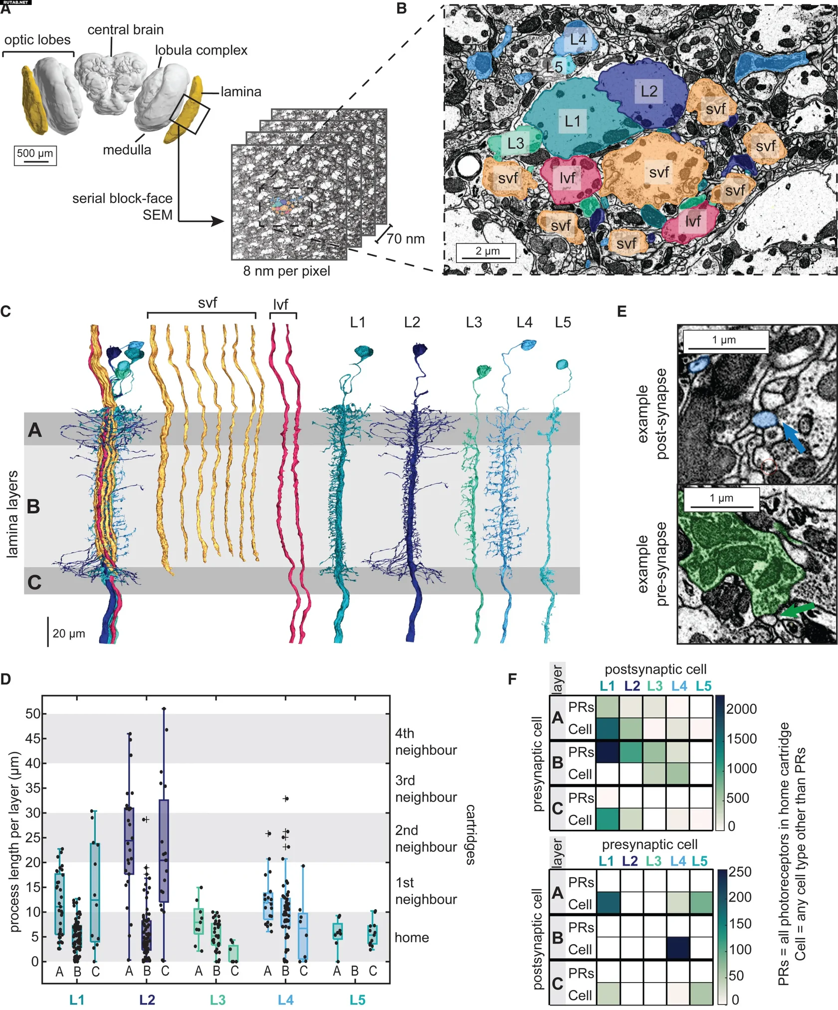 С помощью электронной микроскопии команда идентифицировала и заново классифицировала все типы нейронных клеток ламины, а также составила карту их соединений. Это позволило лучше понять их задачи в зрительной системе.
