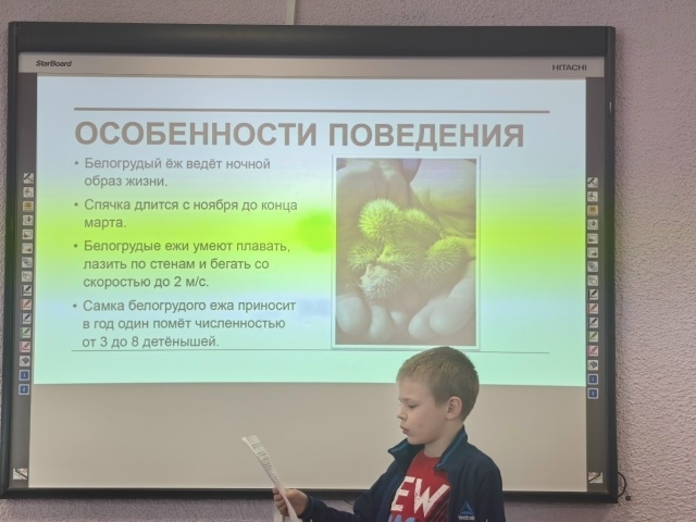 Михаил Кривошеин рассказал об особенностях вида, среде обитания, питании, образе жизни белогрудого ежа, интересных фактах о колючем животном и сравнил поведение ежа в природных условиях и в условиях уголка живой природы.