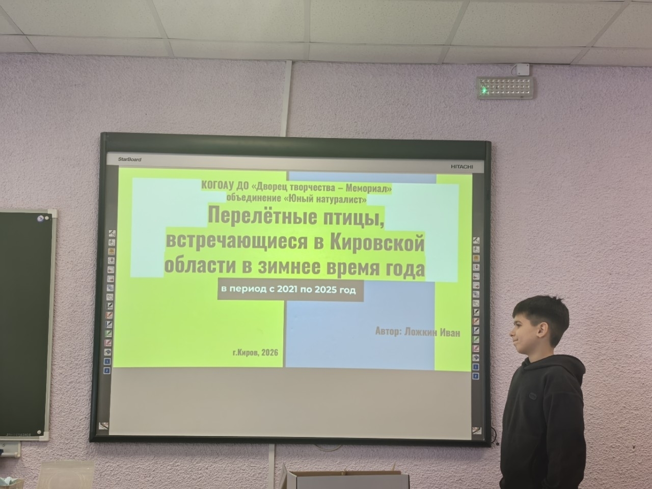 Иван Ложкин изучил источники информации, рассказал о наблюдаемых на территории г. Кирова и Кировской области в зимнее время года перелётных птицах и предполагаемых учёными причинах зимовки данных птиц в наших условиях.