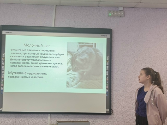 Анастасия Микрюкова, как юный зоопсихолог, рассказала о своём домашнем питомце кошке Симке, о своих наблюдениях за поведением, восприятием животным окружающего мира и отношением к нему.